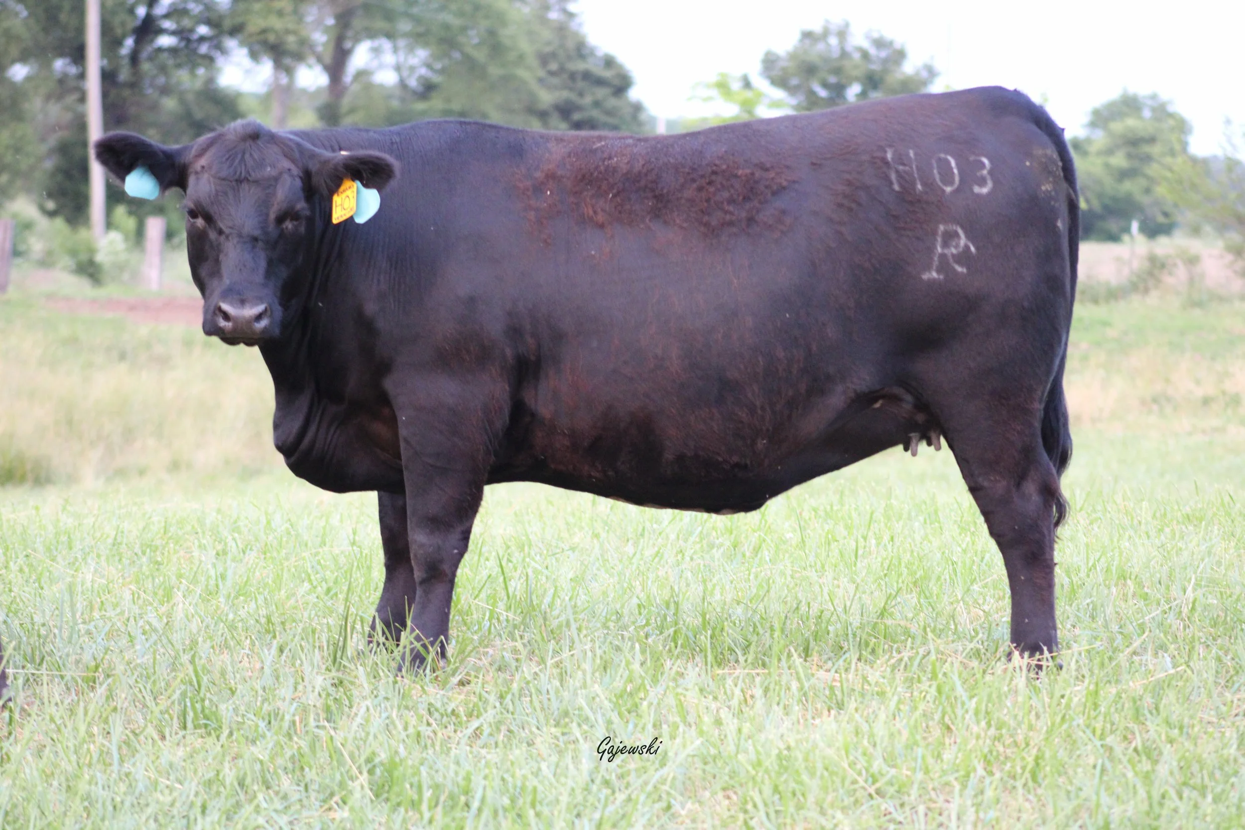 We purchased H03 from the Hinkle’s Prime Cut Angus 2025 Spring sale as a bred heifer. This Veracious daughter is as explosive as they come and one that we have high expectations for. Her pedigree speaks proven performance with both Veracious and Enhance. At HPCA, she was flushed one time via IVF for 12 quality embryos. She is due August 18 with a GAR Powercat bull calf. We will begin flushing her after calving.