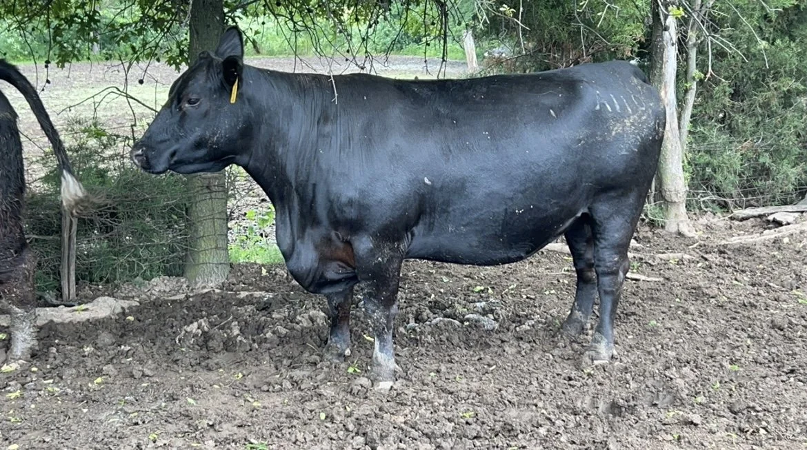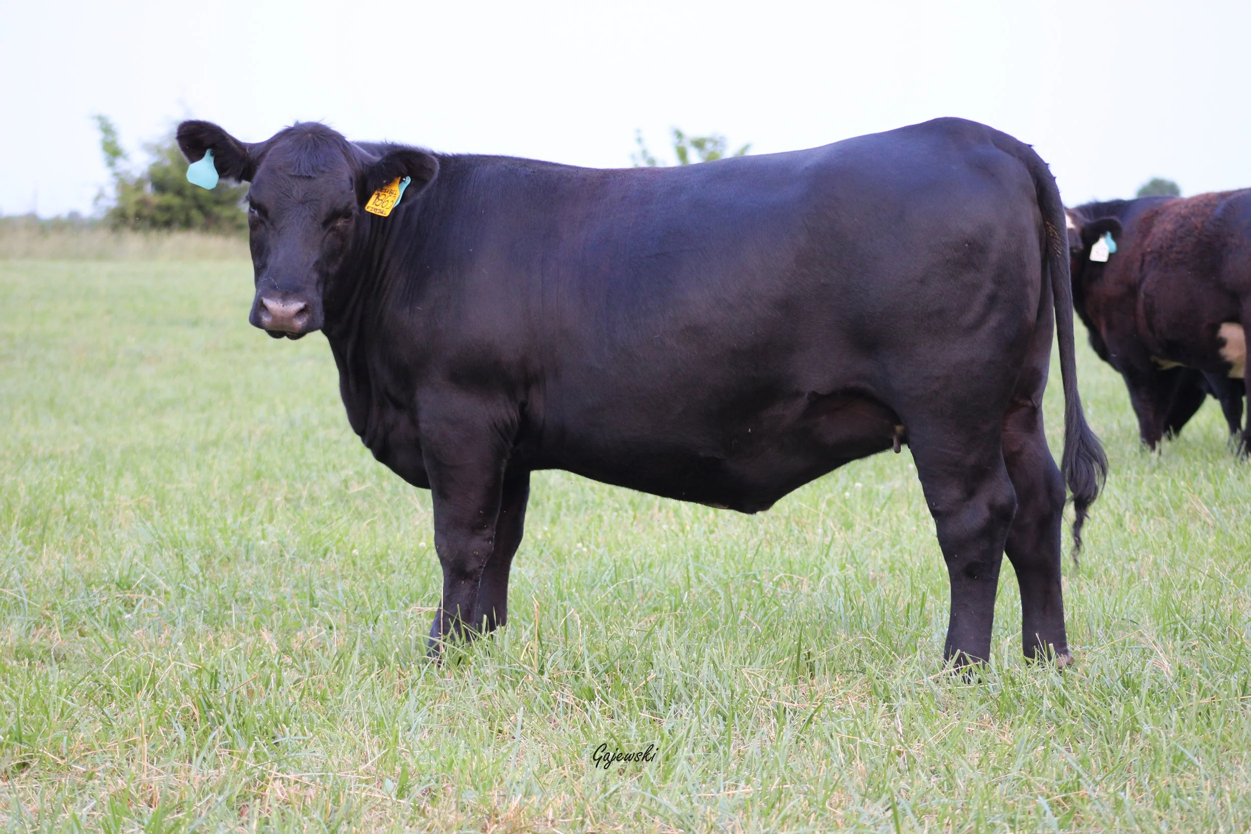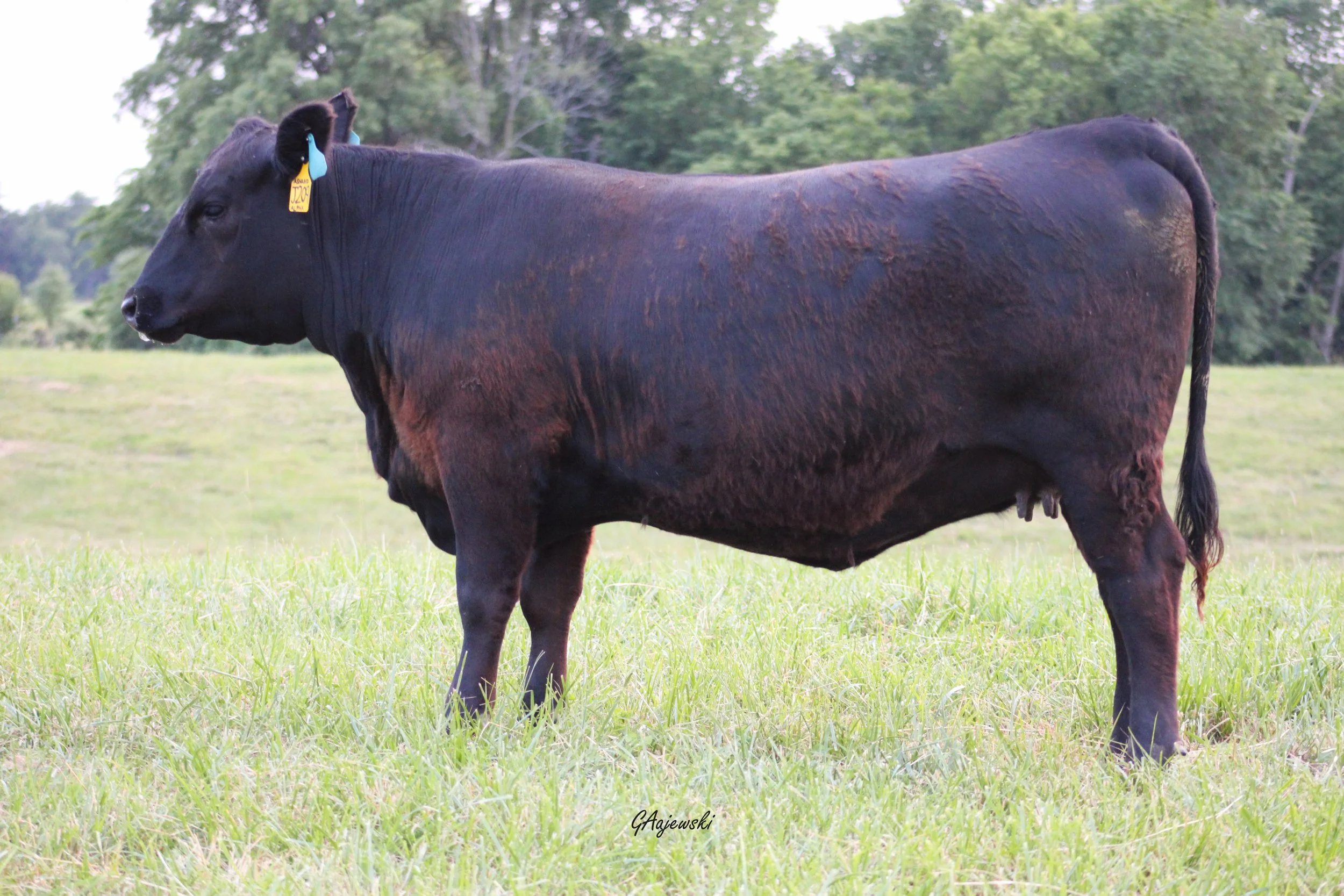 One of only two Athena daughters bred and born here, 63 is one that we are very excited about. This Ratified daughter has a little bit of everything from growth, to maternal, to carcass. We were blessed with the opportunity to sell two of her flush-mate brothers in Hinkle’s Prime Cut Angus production sales for $14,500 and $8,000 respectively. As mentioned above, we also were able to sell 63’s flush-mate sister, 442, back to the Hinkle program. We’ve been able to flush this female three separate times gaining 13 embryos total. Those will be inserted this coming fall. Currently, 63 is pregnant with her first calf, which is expected around the end of September. Keep an eye out for this Athena line because it’s just now getting started!