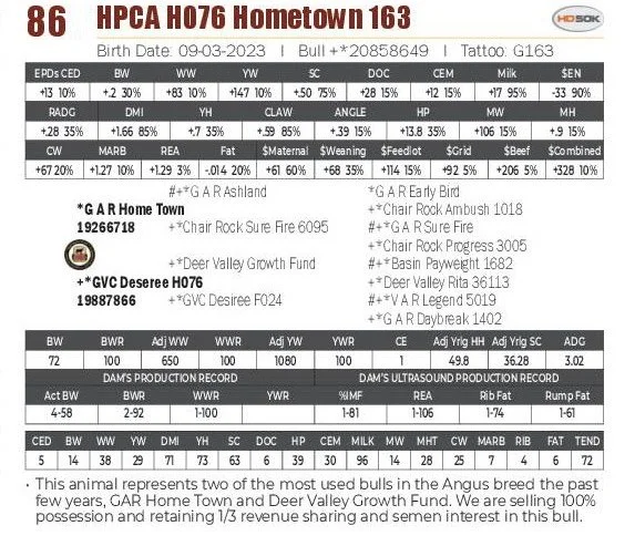 We bought this bull’s mother from Green Valley Cattle in Atkinson, NE. Taking a look at this cow, there’s no doubt that she’s a Growth Fund daughter. Size, frame, and growth are very prominent in this line. This GAR Hometown son is a special one and one that we’re very proud of. His phenotype and exceptional EPD’s really set him apart.